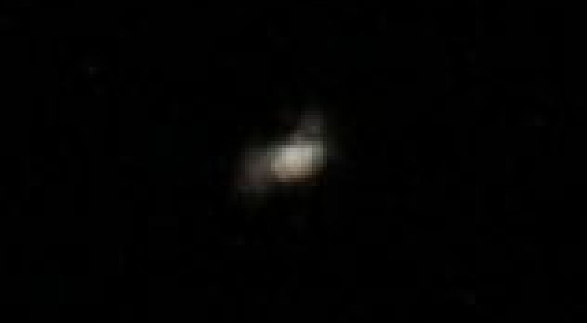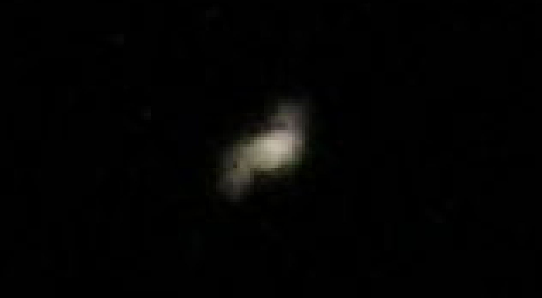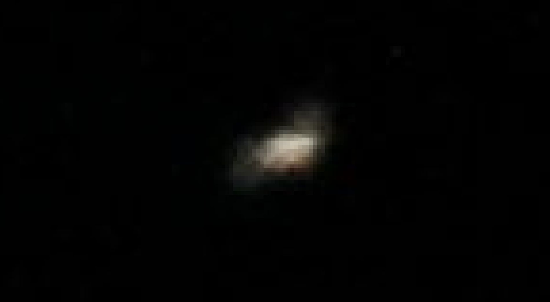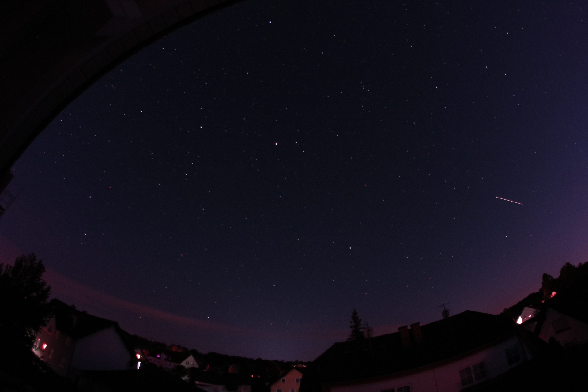 Das Objektiv eignet sich ganz gut, um halbwegs bildfüllende Aufnahmen von großen Objekten wie dem Mond (siehe dieses Bild) oder Orionnebel zu machen und wo leichte Unschärfe zu verkraften ist. Für kleine Objekte wie dem folgenden „ISS Leuchtpunkt“ fehlt es der Optik an Schärfe und wie erwartet an Brennweite.