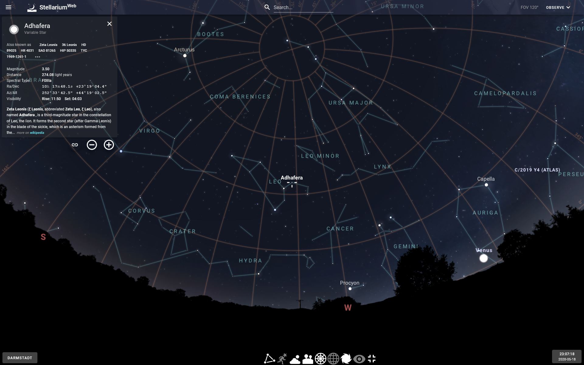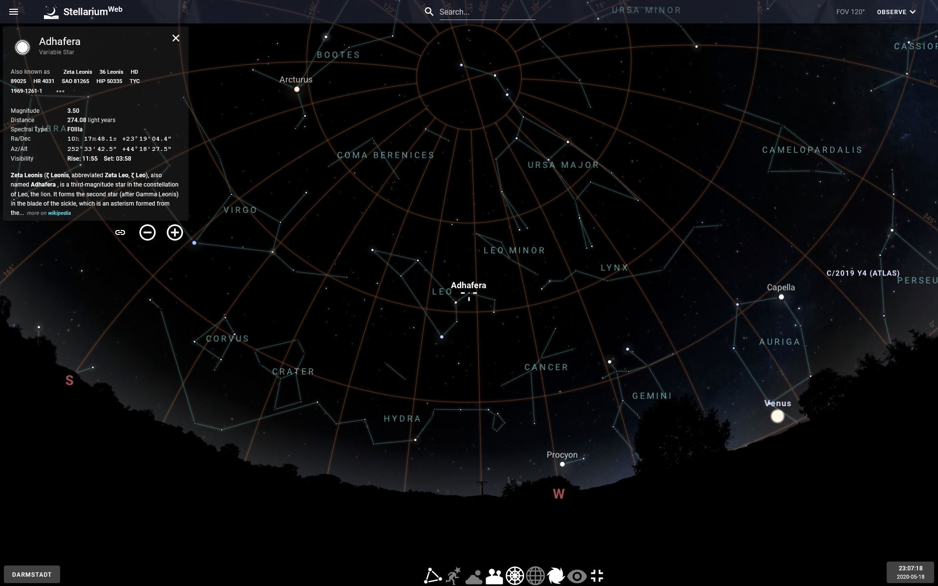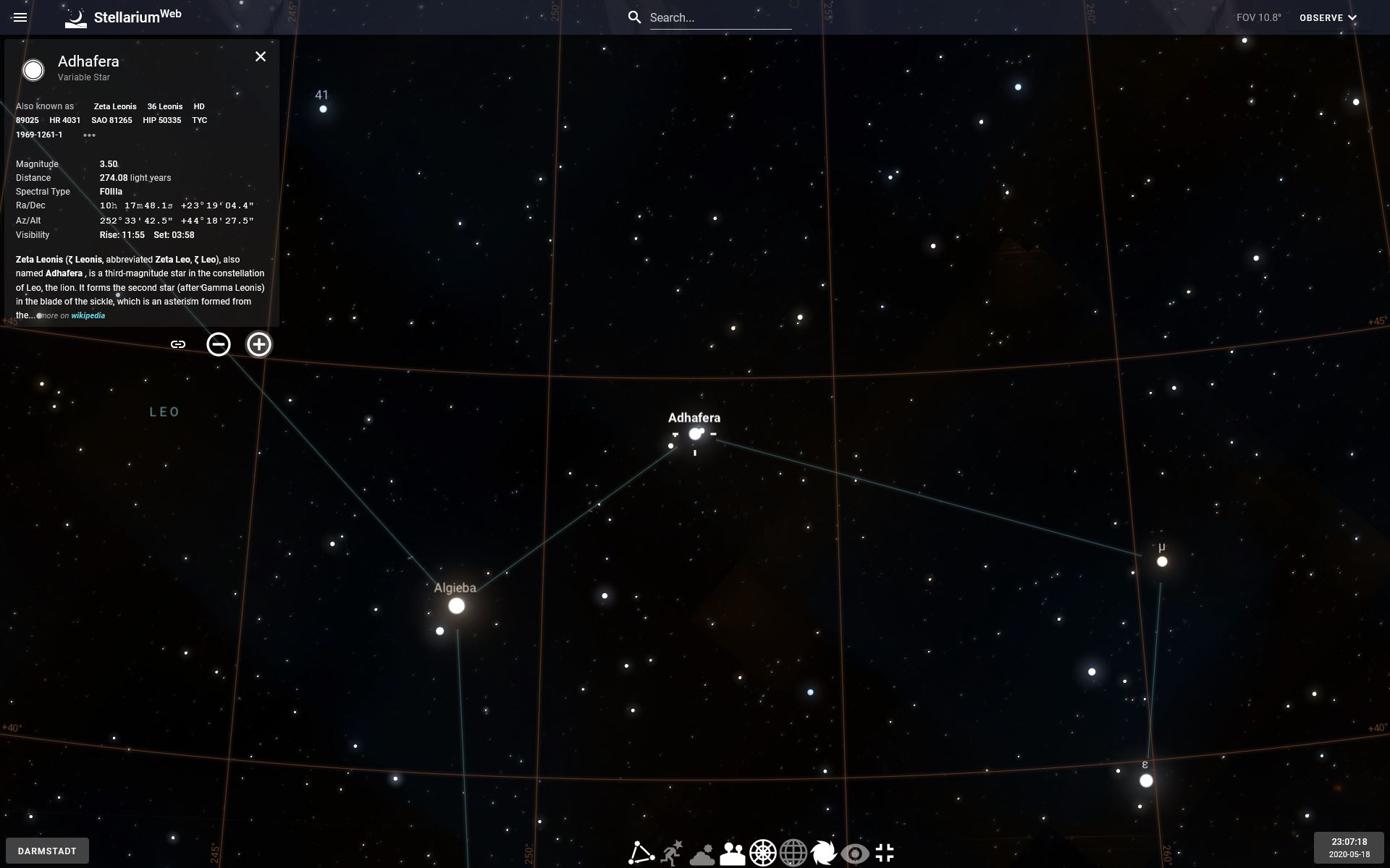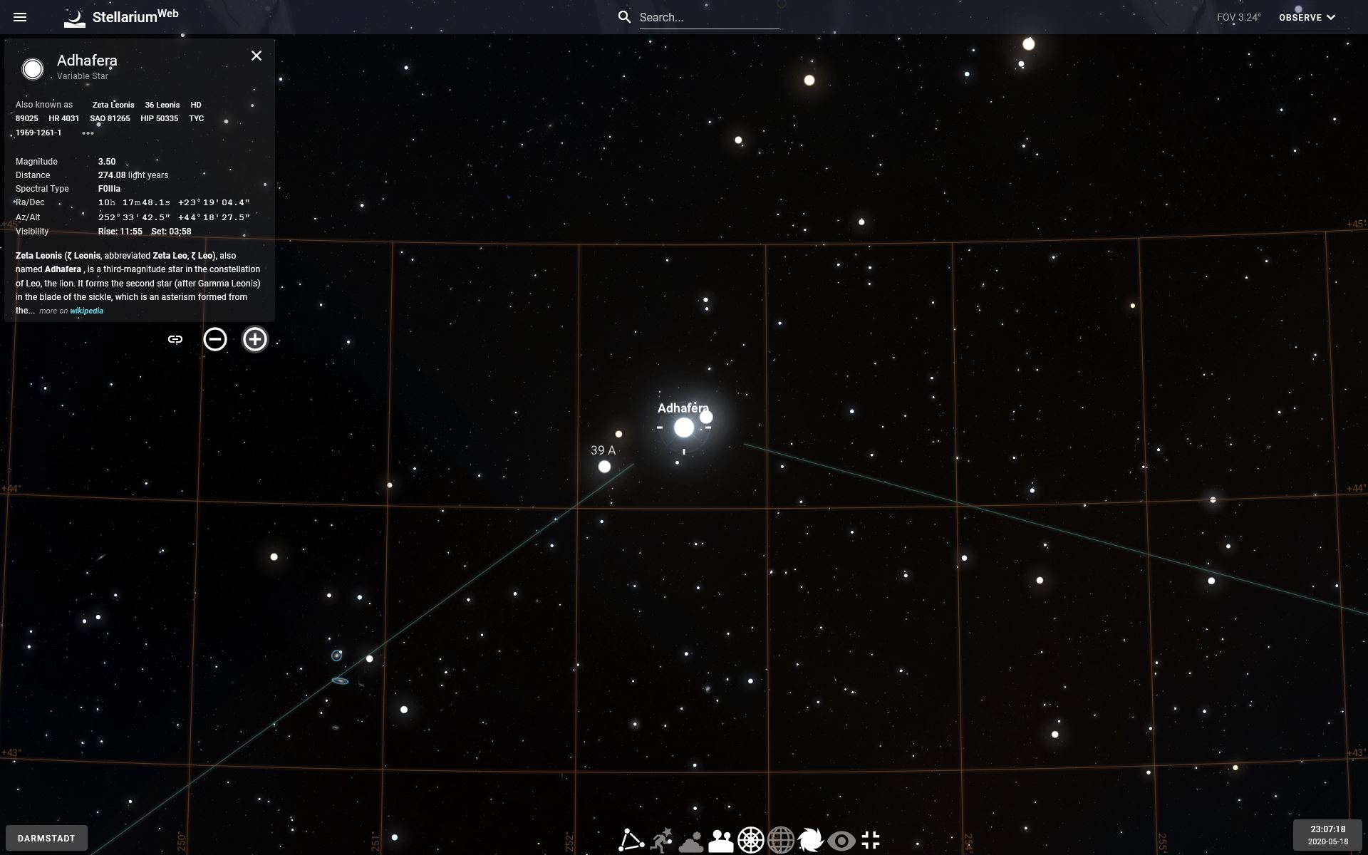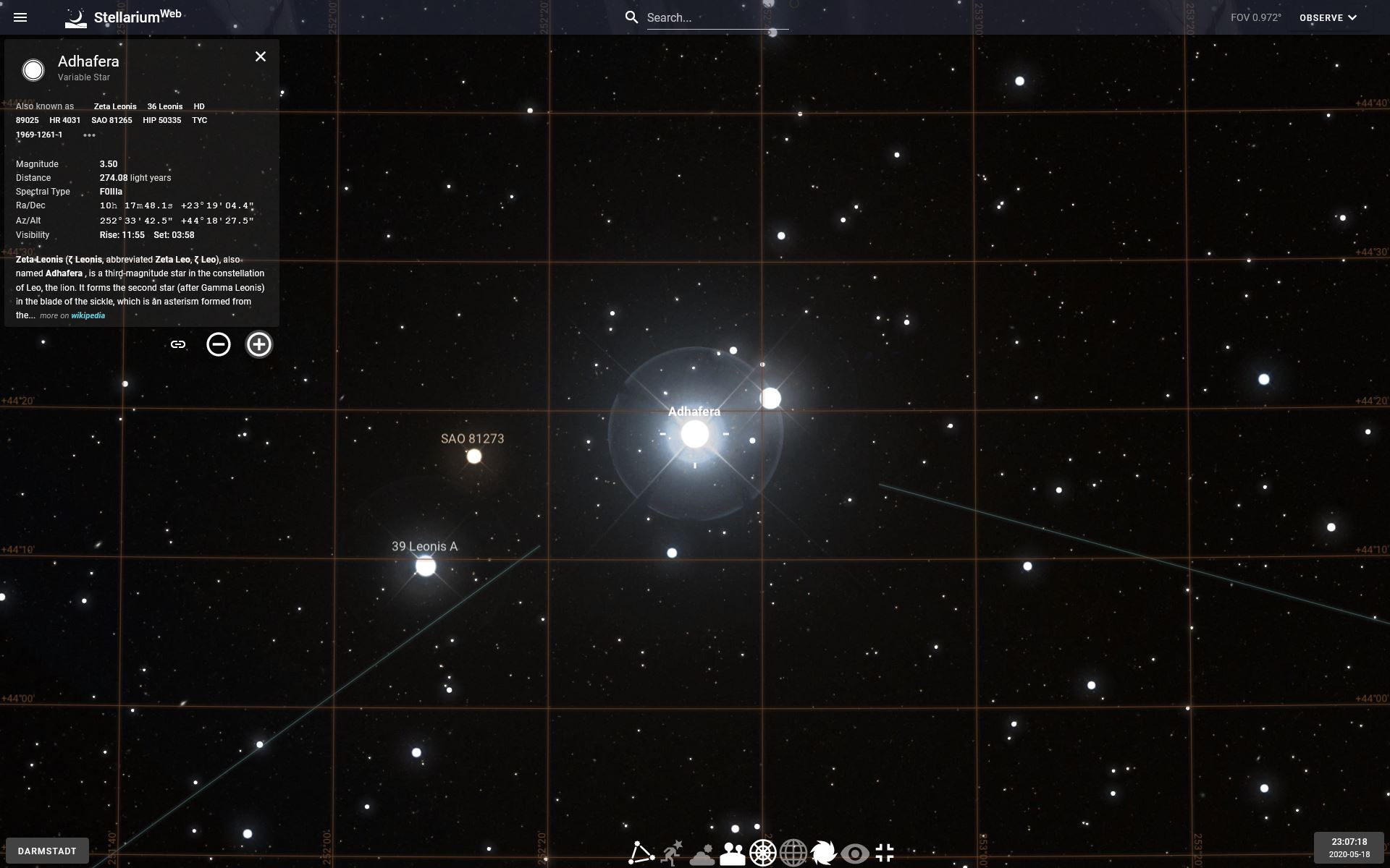Bei meiner Aufnahme im letzten Jahr (am 18.05.2020) habe ich die zweite Ausrichtungs-Möglichkeit (am Stern) verwendet. Beim Zeitraffer-Durchlauf in Stellarium war im voraus zu erkennen, dass die ISS das Sternbild Löwe durchkreuzt und dabei dessen Stern Adhafera sehr nahe kommt. Dieser Stern ist auf den beiden folgenden Stellarium-Screenshots am hellsten und die ISS ist der jeweils größte helle Punkt in den rechten Bildhälften. Beide Screenshots unterscheiden sich in der Vorhersage-Uhrzeit nur um 1 Sekunde. Man sieht schon, dass man bei einer starren Ausrichtung nur ein kleines Zeitfenster zum Fotografieren hat. Nachdem ich die Aufnahmen gemacht hatte, war ich völlig baff, wie genau die Vorhersagen von Stellarium waren.