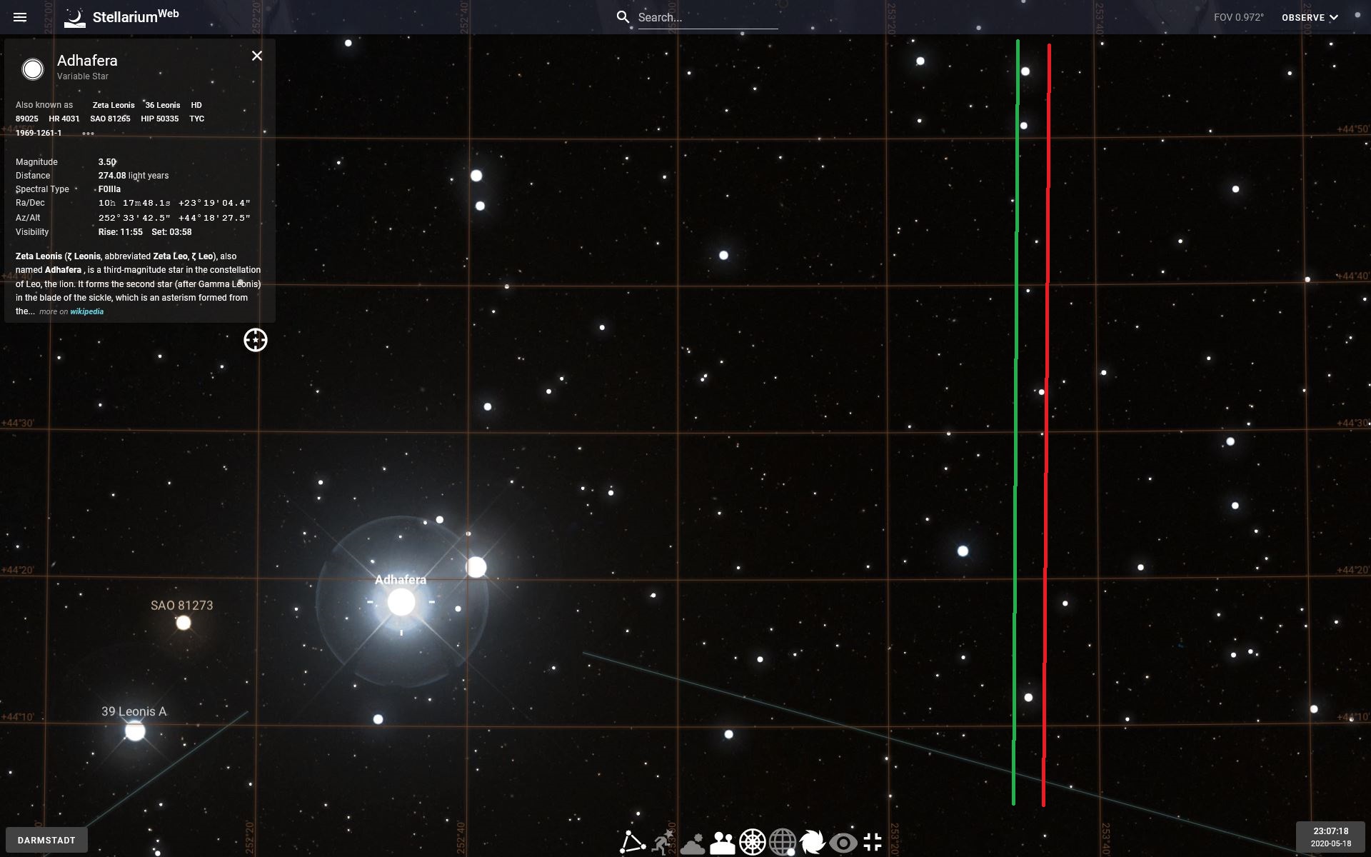 In der folgenden Stellarium-Bilderserie sieht man noch einmal den Übergang von einer großen Übersicht (FOV=120°) bis hin zu einem Zoomlevel (FOV=0,972°), der meiner folgenden Foto-Aufnahme relativ genau entspricht und wo neben dem Stern Adhafera noch dessen größere Nachbarn (Leonis 35 und 39) und viele andere kleine Sterne zu sehen sind. Das letzte Bild in der Serie enthält zwei von mir hinzugefügte Linien. Der vorhergesagte Bahnverlauf der ISS ist die rot eingezeichnete Linie (abgeleitet aus den beiden vorherigen Screenshots vom letzten Jahr) und der tatsächliche Bahnverlauf (abgeleitet aus den echten Fotoaufnahmen) entspricht der grünen Linie.