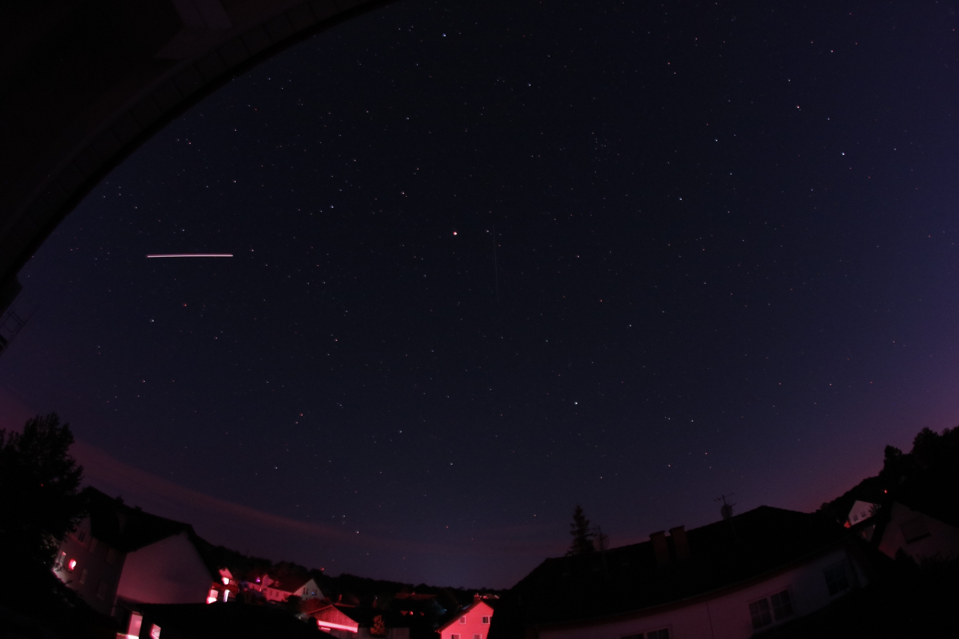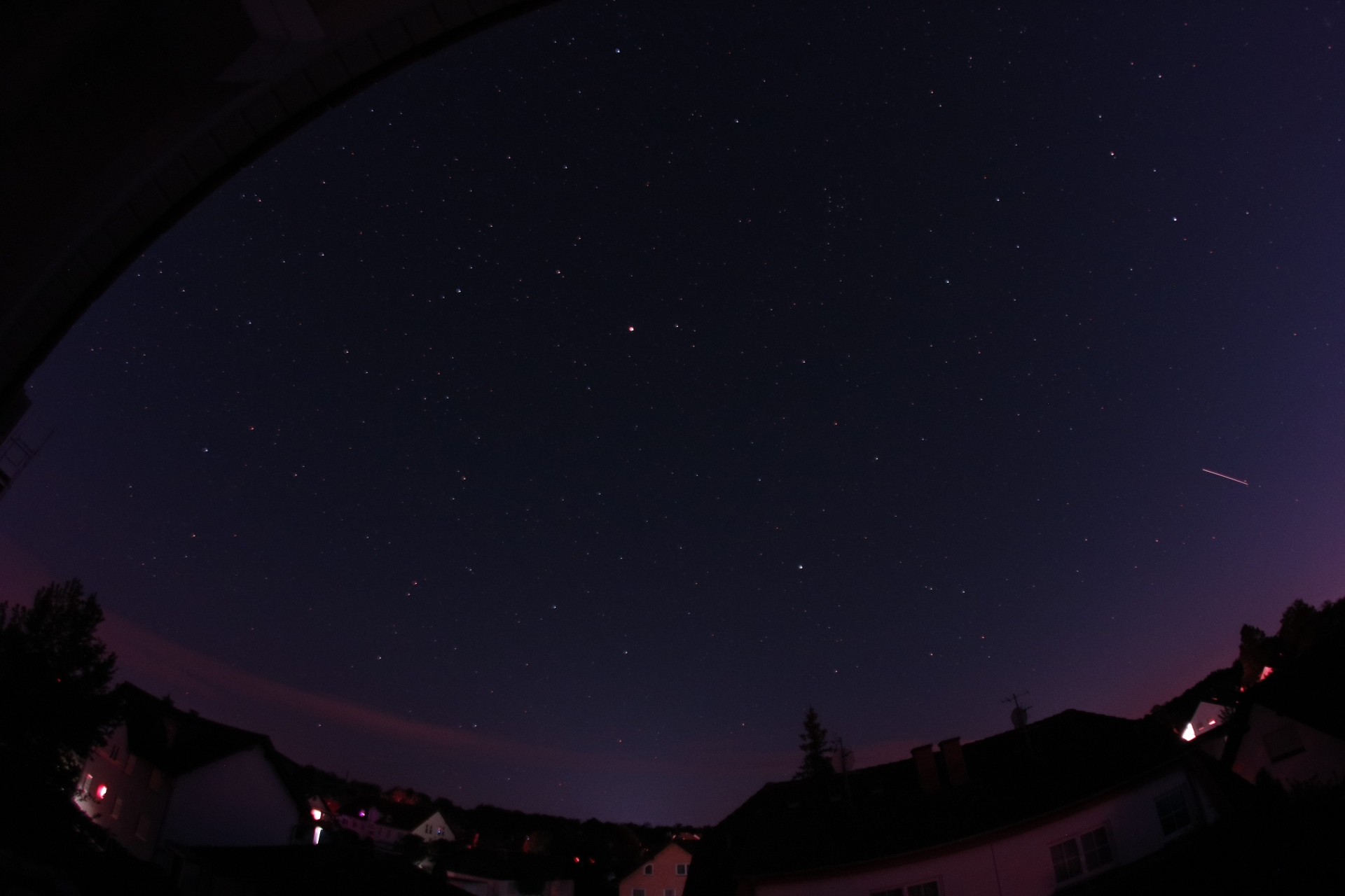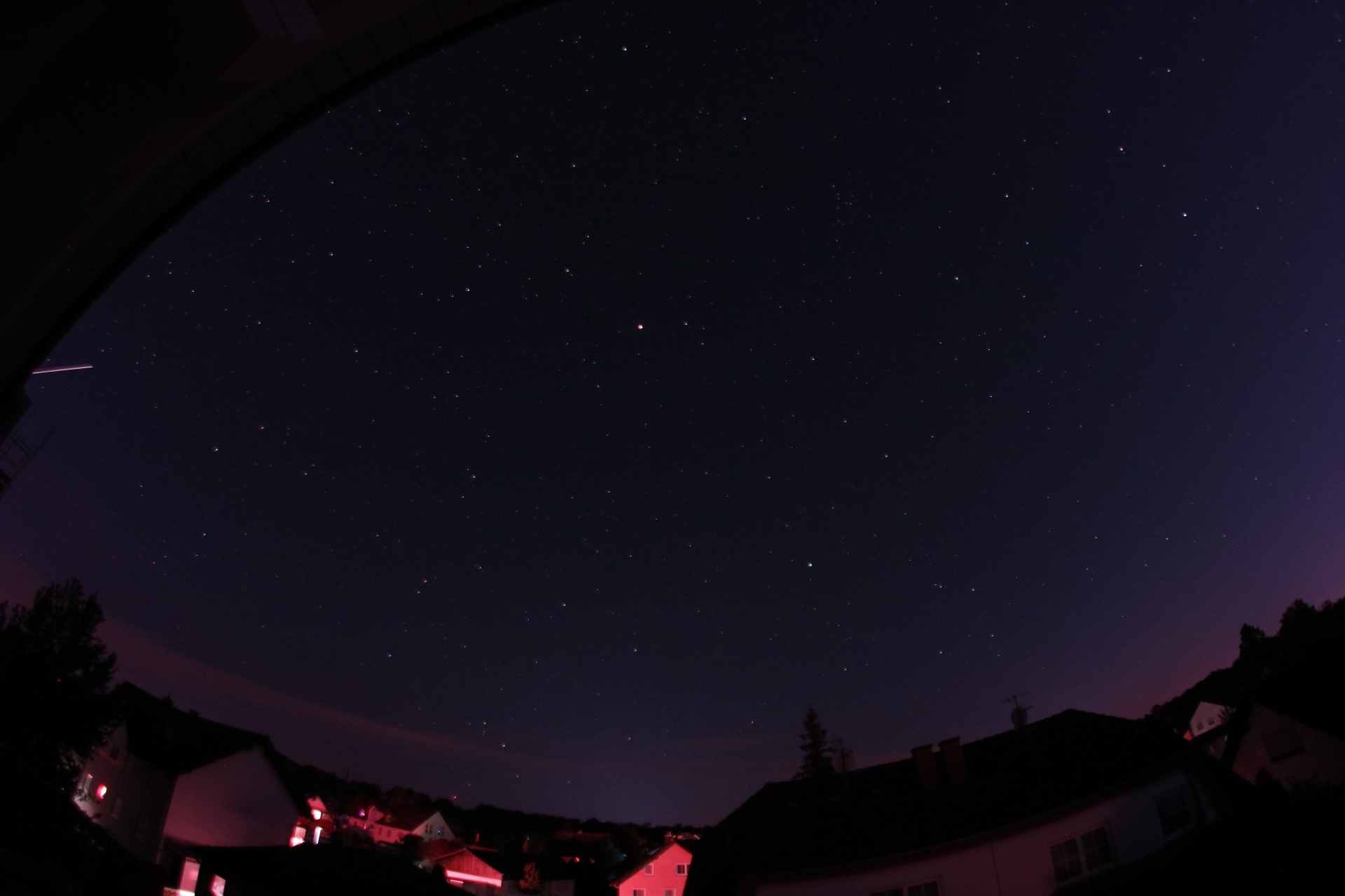 Zu meinen ersten Aufnahmeversuchen gehörte eine Reihe von Langzeitbelichtungen von jeweils 25 Sekunden mit einer digitalen Spiegelreflex-Kamera und einem FischEye-Objektiv (Brennweite 8mm). Solche Aufnahmen kann man aber auch mit dem Smartphone machen, wenn die Kamera-App einen manuellen Modus unterstützt und man die Belichtungszeit, Blende, ISO und Fokus selber einstellen kann.
